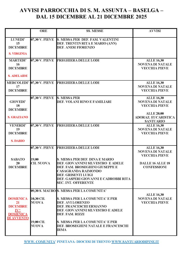 AVVISI PARROCCHIA S. MARIA ASSUNTA – BASELGA – dal 15 DICEMBRE al 21 DICEMBRE 2025