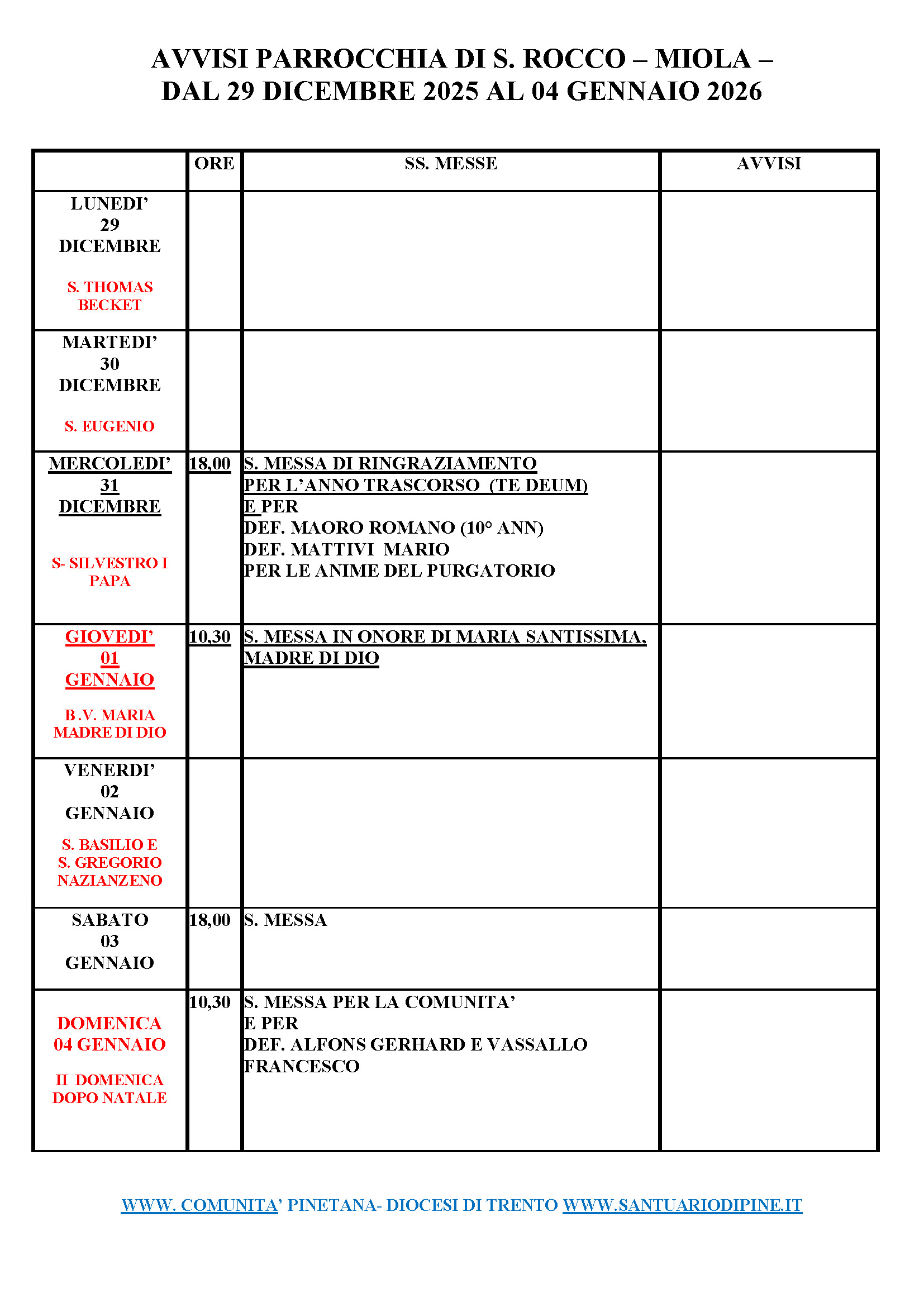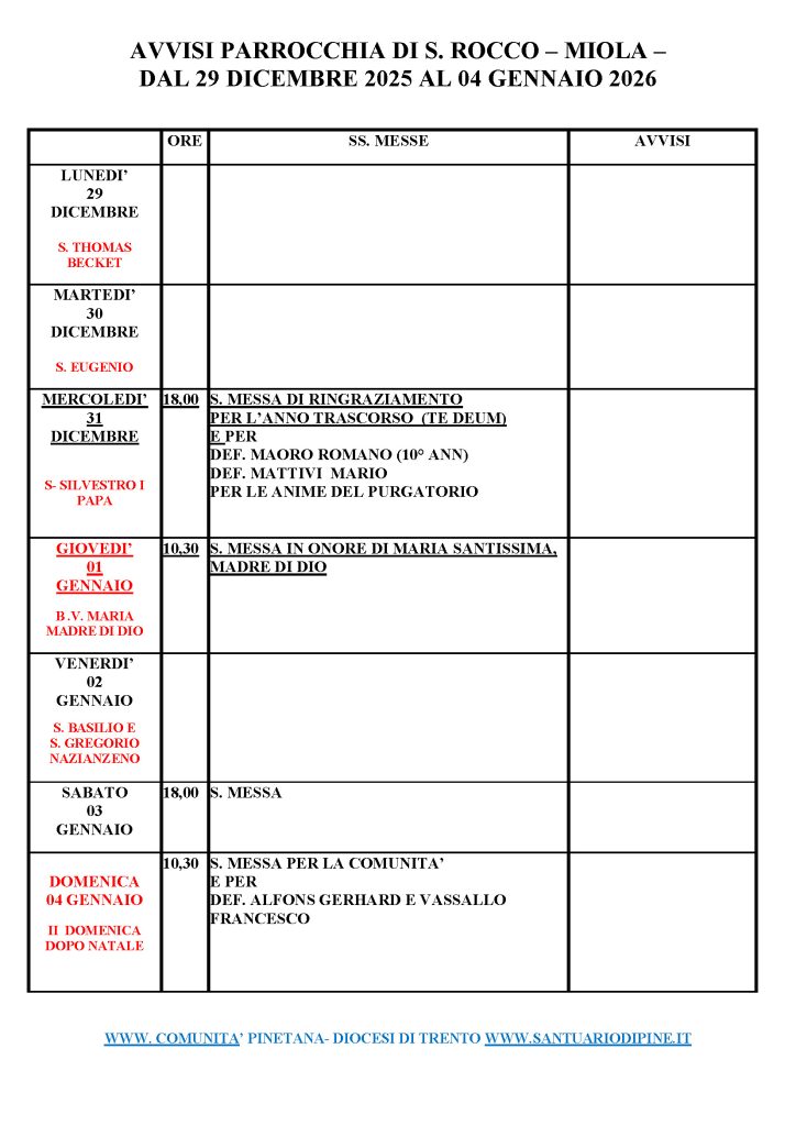 AVVISI PARROCCHIA DI S. ROCCO – MIOLA – dal 29 DICEMBRE 2025 al 4 GENNAIO 2026 Pubblicato il 30 Dicembre 2025 San Rocco MiolaVita comunitaria Share this...FacebookGoogleTwitterLinkedin Share this...FacebookGoogleTwitterLinkedin