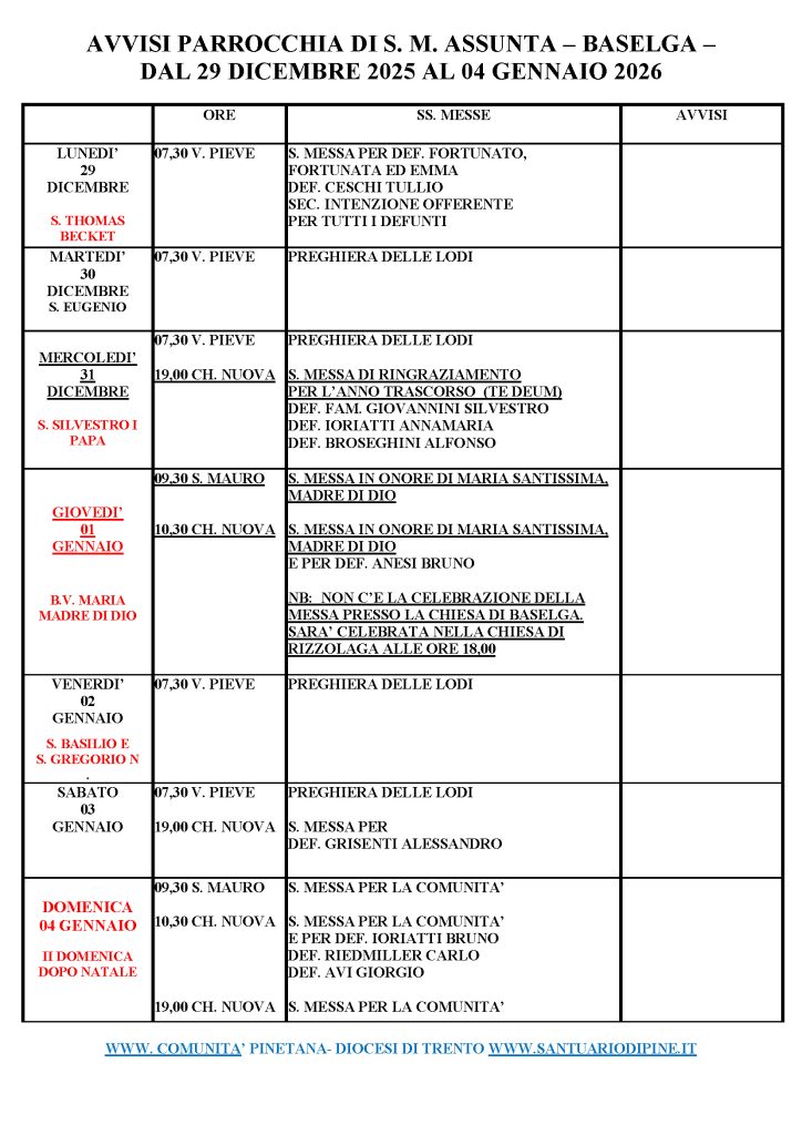 AVVISI PARROCCHIA S. MARIA ASSUNTA – BASELGA – dal 29 DICEMBRE 2025 al 4 GENNAIO 2026 Pubblicato il 30 Dicembre 2025 S. Maria Assunta - BaselgaSan MauroVecchia Pieve - BaselgaVita comunitaria Share this...FacebookGoogleTwitterLinkedin Share this...FacebookGoogleTwitterLinkedin