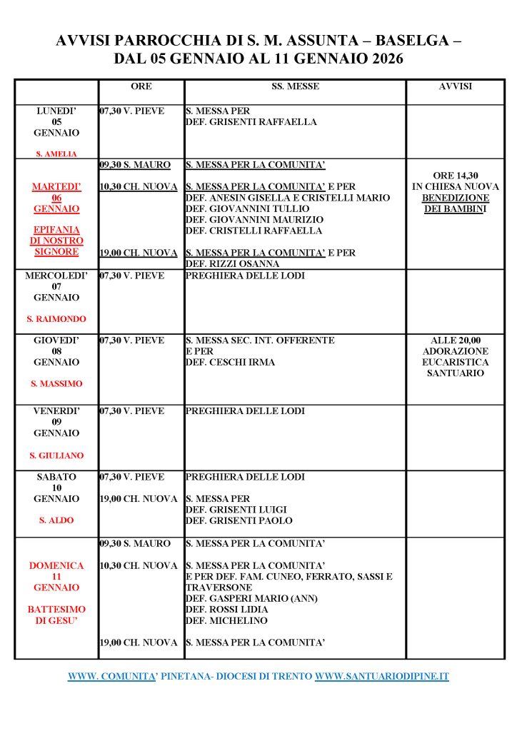 AVVISI PARROCCHIA S. MARIA ASSUNTA – BASELGA – dal 5 GENNAIO al 11 GENNAIO 2026 Pubblicato il 5 Gennaio 2026 S. Maria Assunta - BaselgaSan MauroSantuario MontagnagaVecchia Pieve - BaselgaVita comunitaria Share this...FacebookGoogleTwitterLinkedin Share this...FacebookGoogleTwitterLinkedin