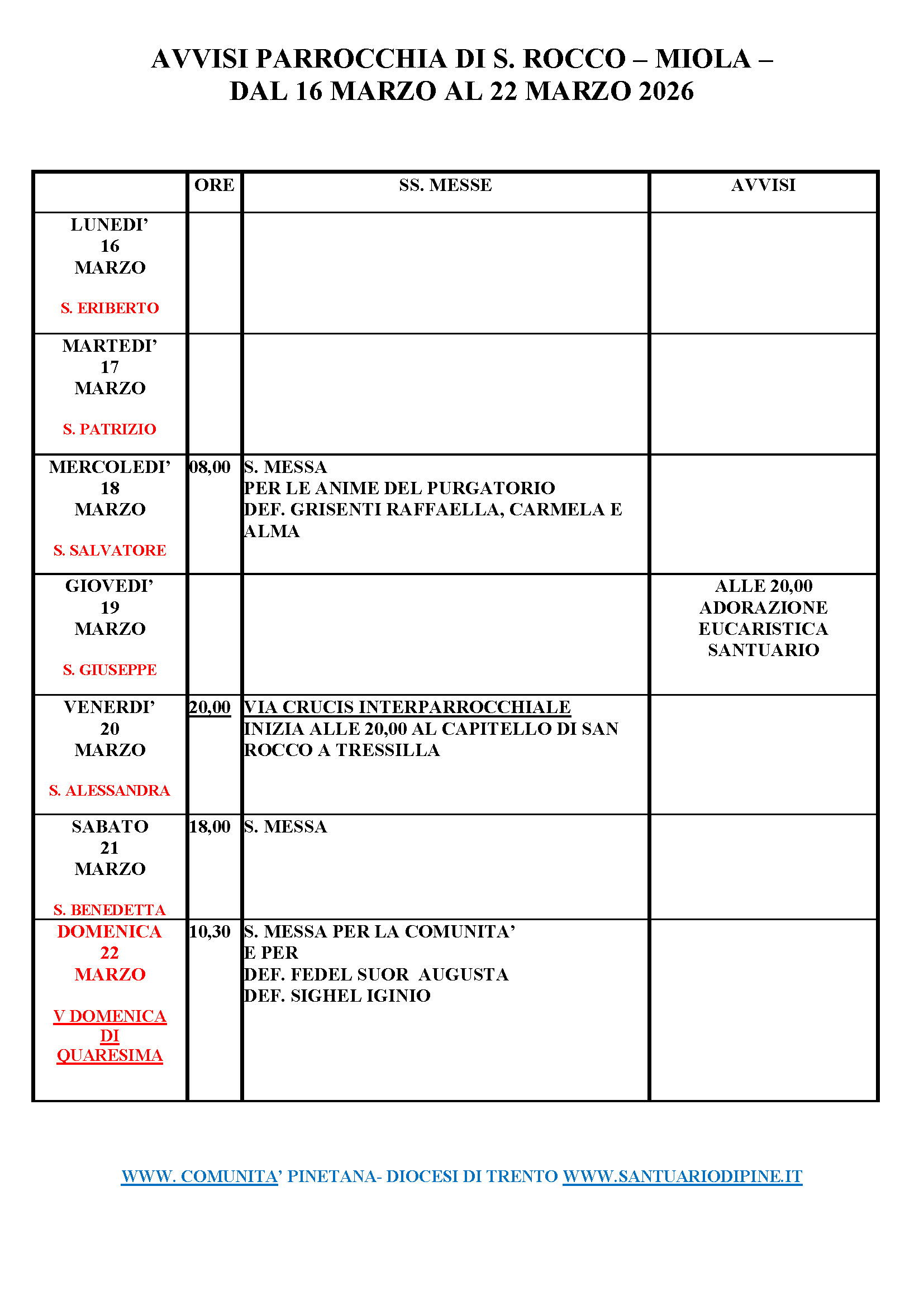 • AVVISI PARROCCHIA DI S. ROCCO – MIOLA – dal 16 MARZO al 22 MARZO 2026 16 Marzo 2026