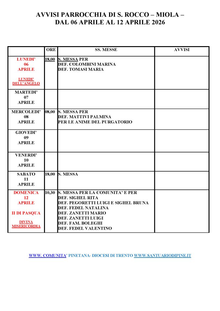 • AVVISI PARROCCHIA DI S. ROCCO – MIOLA – dal 6 APRIL al 12 APRILE 2026 1 Aprile 2026
