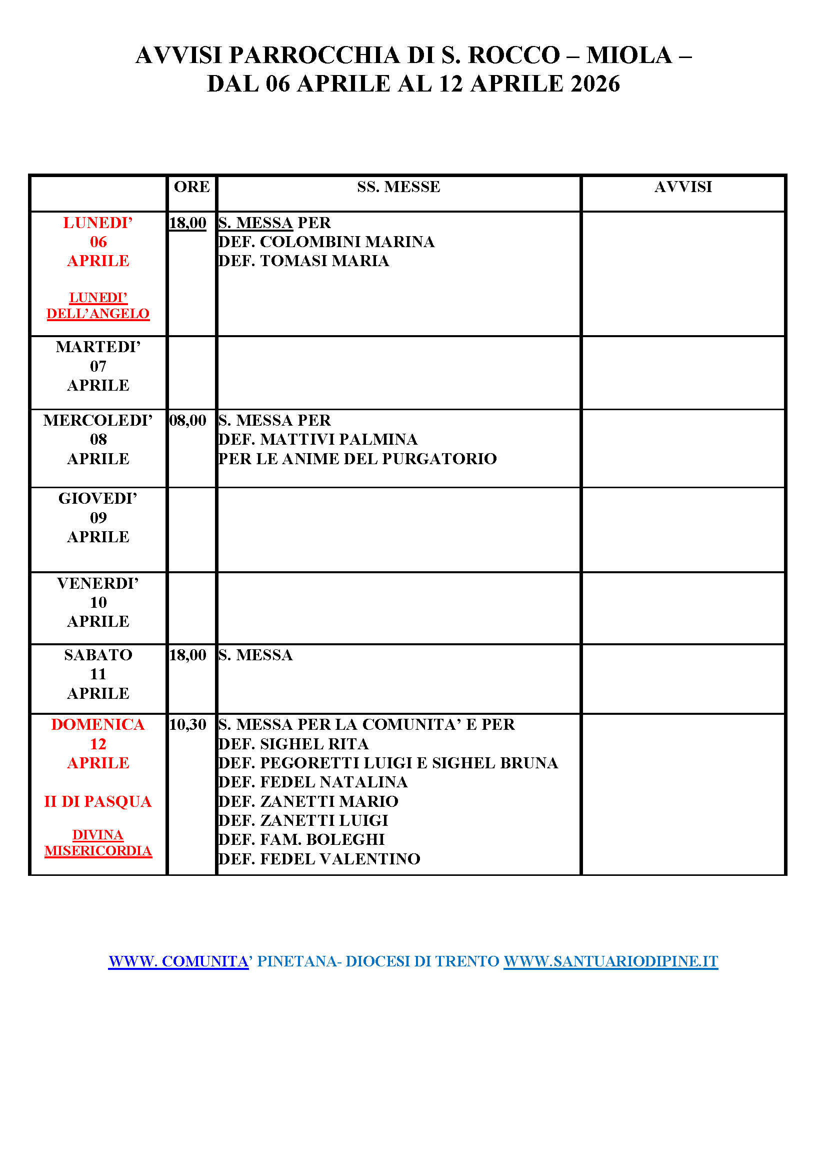 • AVVISI PARROCCHIA DI S. ROCCO - MIOLA - dal 6 APRIL al 12 APRILE 2026