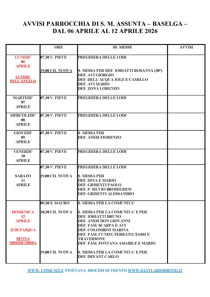 AVVISI PARROCCHIA S. MARIA ASSUNTA – BASELGA – dal 6 APRILE al 12 APRILE 2026